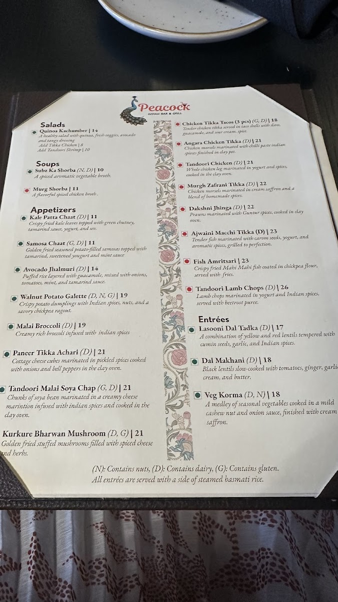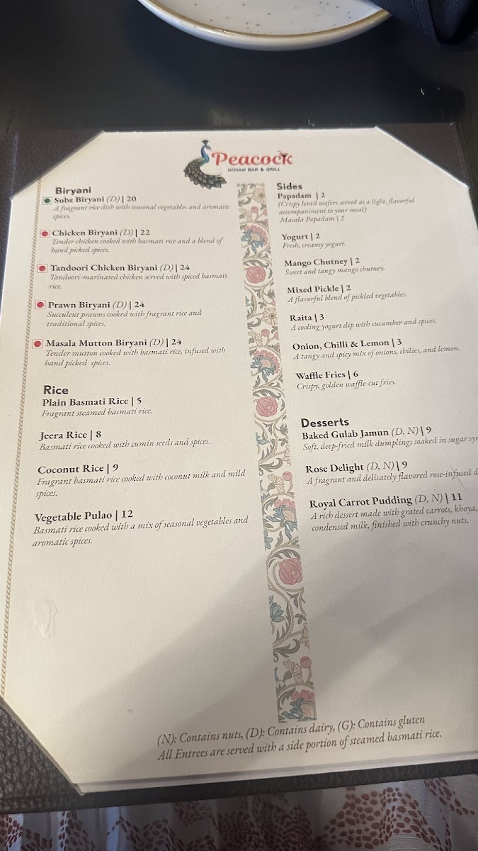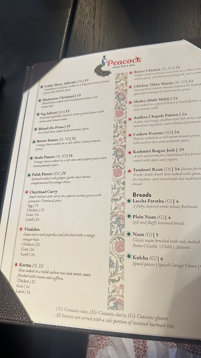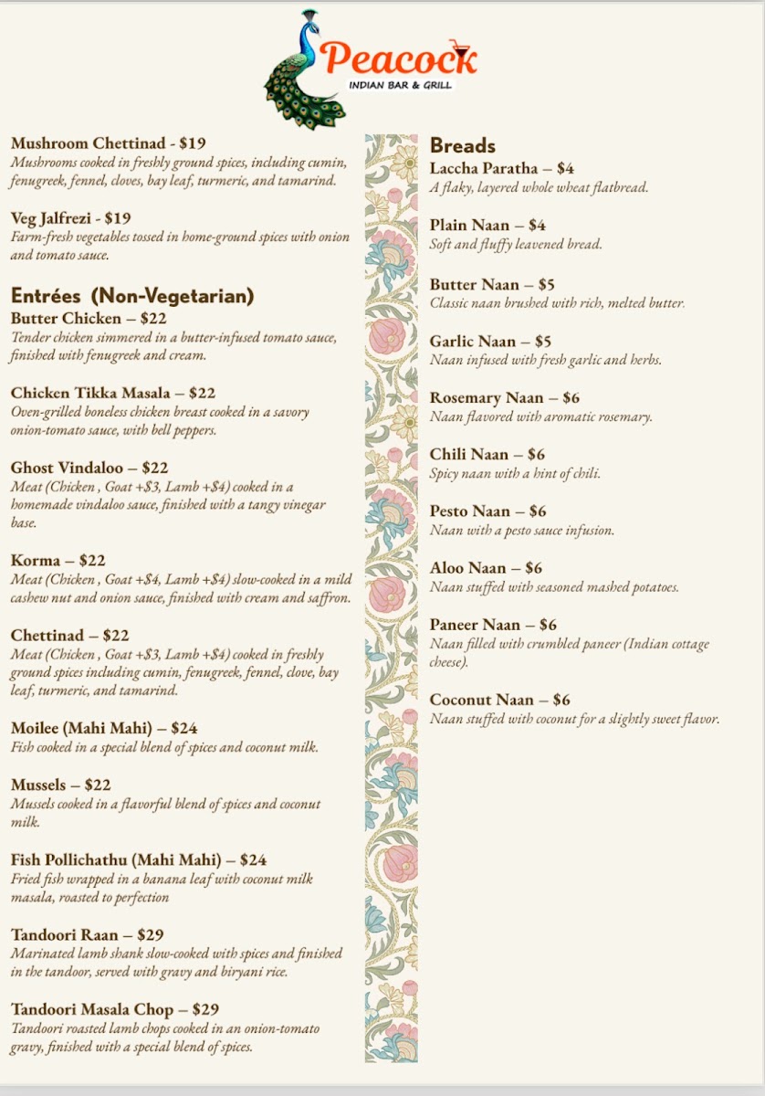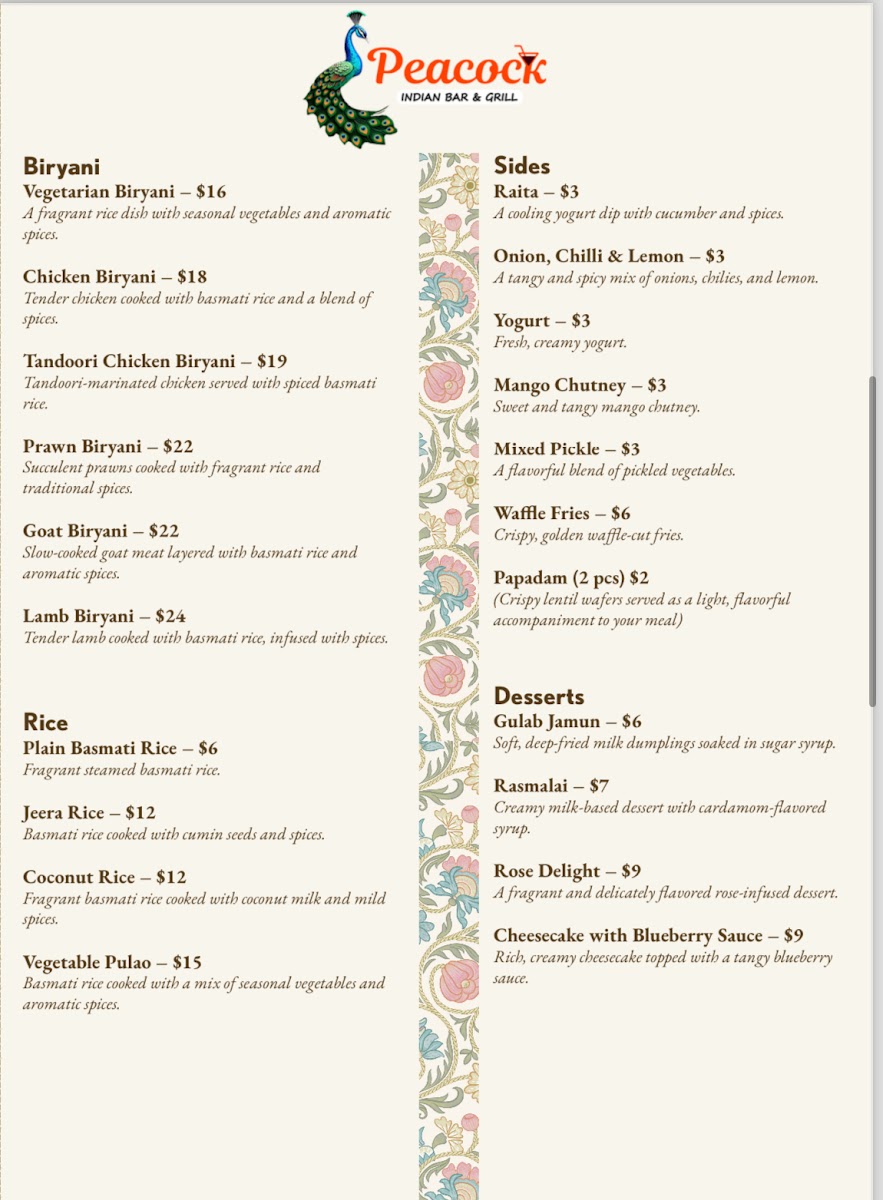 Peacock Indian Bar & Grill Menu
